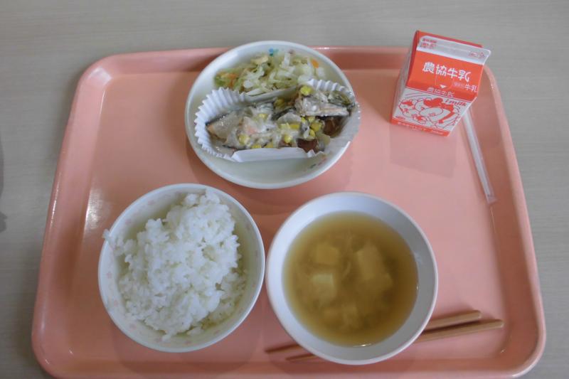 ごはん 鮭のマヨネーズ蒸し ごま酢和え みそ汁 牛乳