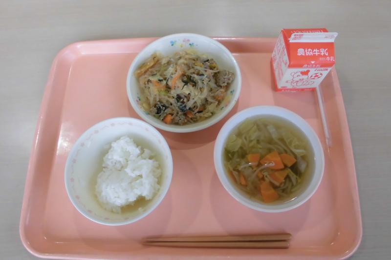 ごはん 焼きビーフン 鶏だんごスープ 牛乳