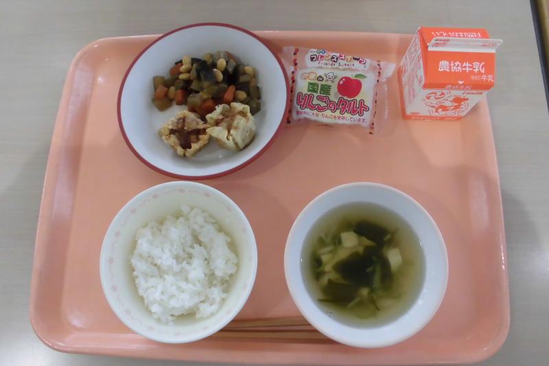 ごはん 揚げシューマイ 大豆の五目煮 すまし汁 りんごのタルト 牛乳