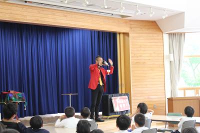 今日はマジック鈴木さんらが、高知県からわざわざマジックを見せに来てくださいました。校長先生がサインしたトランプが、いつの間にかペットボトルの中に入ったり、テーブルが宙に浮いたりビックリです!!