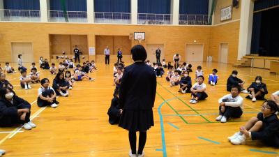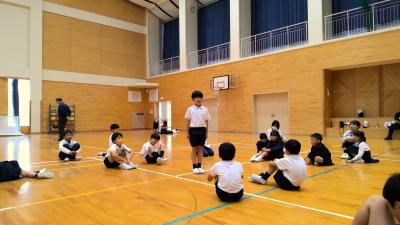 1年生はこの日、広い体育館で体育を初めてしました。宮田先生から気を付けてほしいことのお話を聞いて、体育館で活動しました。