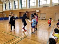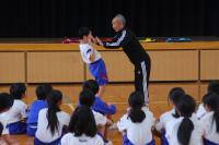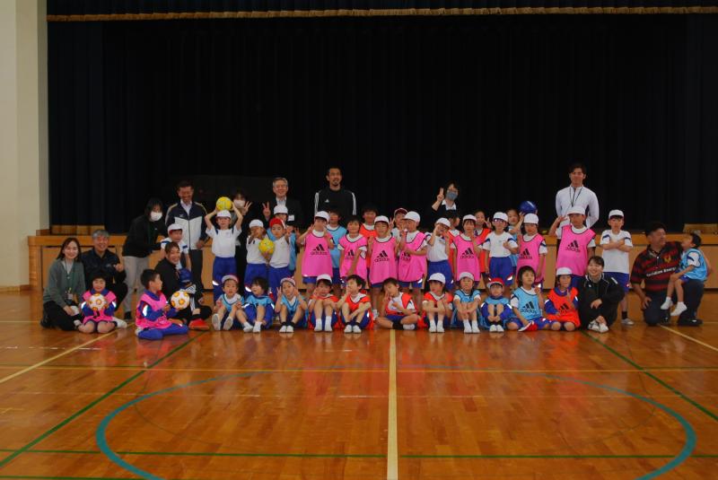 JFA(日本サッカー協会)の協力を得て、元プロサッカー選手の久保さん、山根さん、指導員の北野さんに、全校児童が運動の楽しさや、ボールを使った運動を教えていただきました。