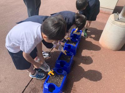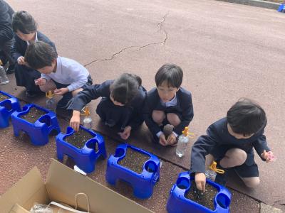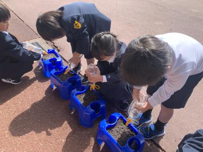 1年生の生活科では、アサガオを植えて生長の様子を観察します。児童は、「早く芽が出ますように」「よく育ちますように」心を込めて植えました。