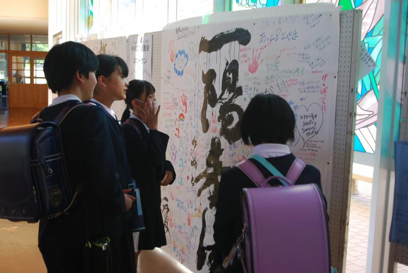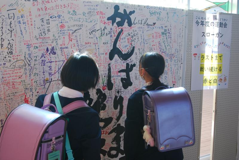 全国各地から、温かい応援メッセージをいただいています。先日、富山の滑川ショッピングセンター「YELL」さんで、書かれたメッセージを児童が読んでいる様子です。