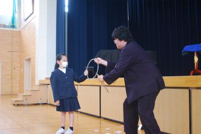 今日はマジック鈴木さんらが、高知県からわざわざマジックを見せに来てくださいました。校長先生がサインしたトランプが、いつの間にかペットボトルの中に入ったり、テーブルが宙に浮いたりビックリです!!