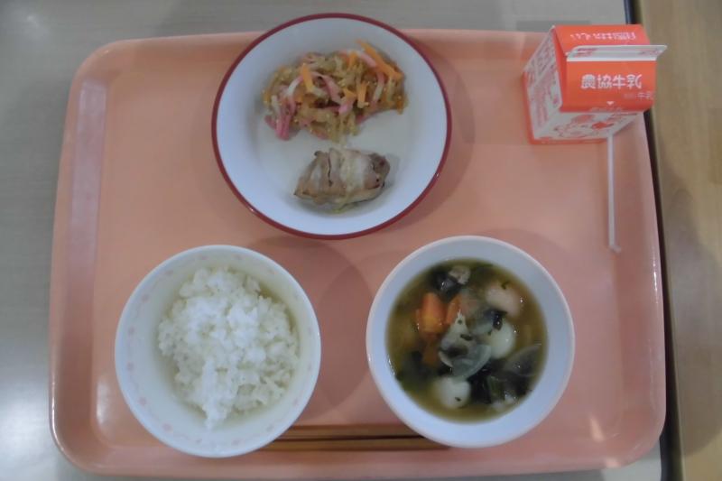 わかめごはん キャベツとひき肉の炒め物 鶏ごぼう汁 牛乳