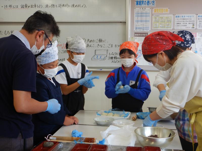 5年生は総合の時間の学習「お米を作ろう!」のまとめとして、収穫祭を行いました。春に田植えをして育った米を刈り取って、本日保護者の皆さまと一緒におはぎを作りました。