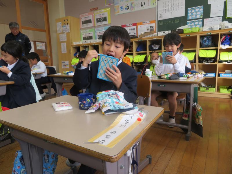 今日は、歯科衛生士の小下先生に「正しい歯のみがき方」を教えていただきました。染め出し液で染まった歯の汚れを、歯ブラシのいろんなところを使ってやさしく磨きます。きれいにスッキリした1年生、これからも正しいみがき方でむし歯0を目指しましょう!