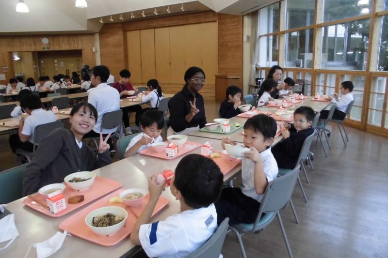 今日はALTのアレクサ先生が来校しました。1年生と一緒に食べました。