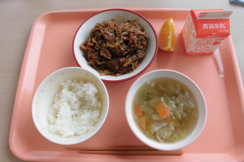 ごはん マーボー春雨 野菜スープ オレンジ 牛乳