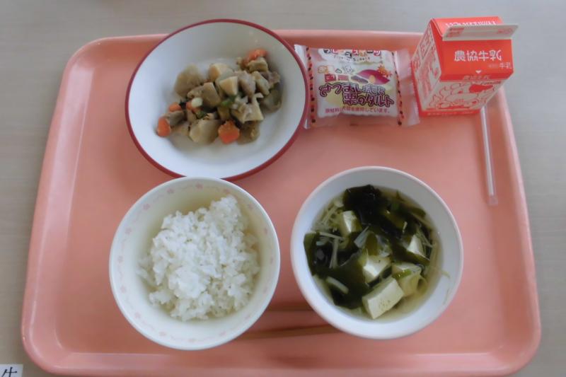ごはん 筑前煮 すまし汁 さつまいもと栗のタルト 牛乳