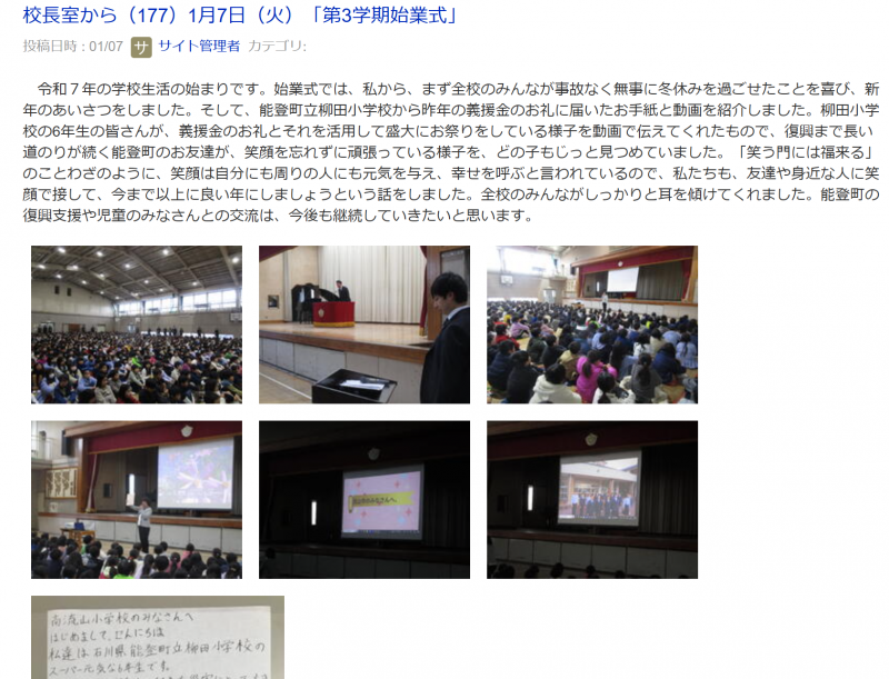 6年生は昨年末に流山市内の小学校へ、義援金のおかげで「柳田小笑顔まつりwith町野小」ができたことに感謝して、お礼の手紙と笑顔まつりの様子を映したDVDを送りました。そこで、流山の小学校では、始業式や学校だよりで紹介してくだいさいました。