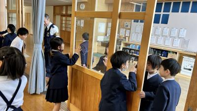 警視庁から3名の警察官の方がいらして、3・4年生に出前授業をしていただきました。警察と警視庁のちがいや、仕事の内容など教えていただきました。また、黒白じゃないパトロールカーを見せていただいたり、指紋採取の実技も体験させていただきました。