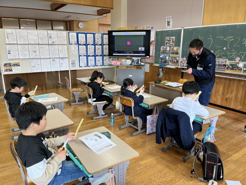 2年生は、佐藤先生と図工の授業を行いました。教材は「くるくる回るうさぎ」を教えてもらいました。設計図どおり切って、折り曲げればできあがりです。できた後は、2階からロビーへ落として遊びました。