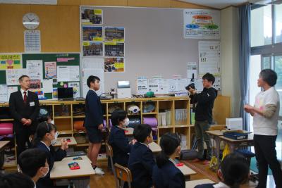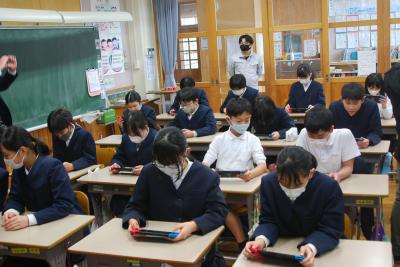 本日、5・6年生を対象に、NTT西日本の中島賢一さんによる、スイッチを使ってプログラミング体験をしました。今回は、熊本県の山鹿市の6年生が作成したゲームを体験しましたが、なかなかクリアすのに苦戦していたようです。