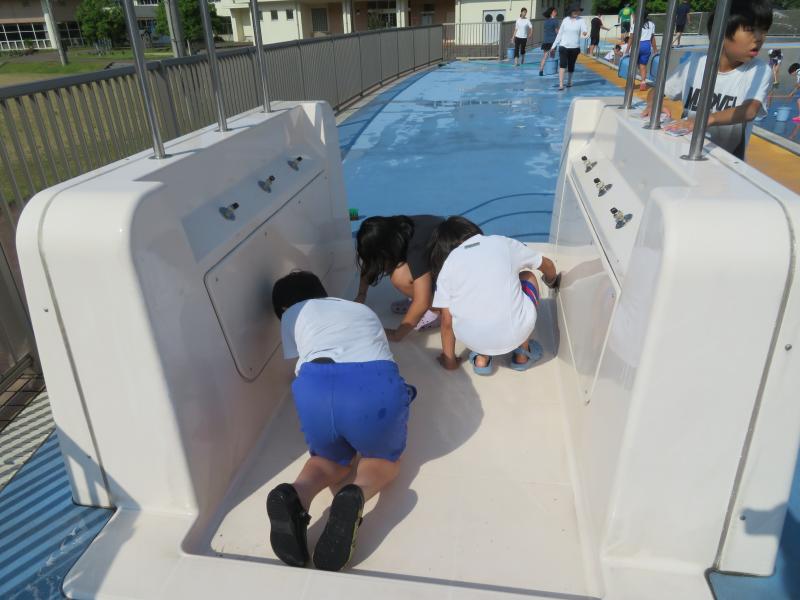 5・6年生がきれいにしてくれたプールに、ようやく入ることができます。プール学習では、事故のないように大切なルールがあります。そのルールも5・6年生が手本を見せてくれました。