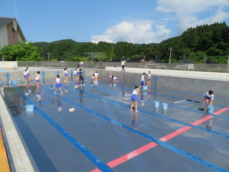 今年もプールの季節がやってきました。5・6年生が一生懸命に掃除をしてくれました。そのおかげで、今年も気持ちよくきれいなプールで水泳学習が出来そうです。