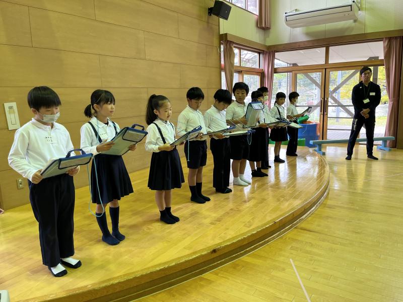児童集会では、2年生が英語の歌「BINGO」を、4年生は詩「この胸に」の音読を披露してくれました。どちらも堂々と大きな声で発表することができました。