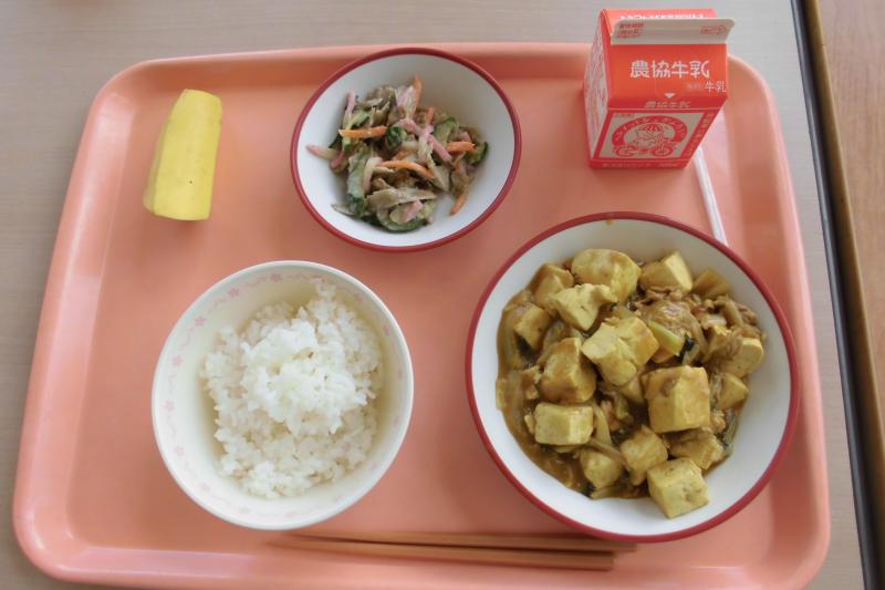 ごはん ごぼうサラダ 豆腐のカレー煮 果物(バナナ) 牛乳