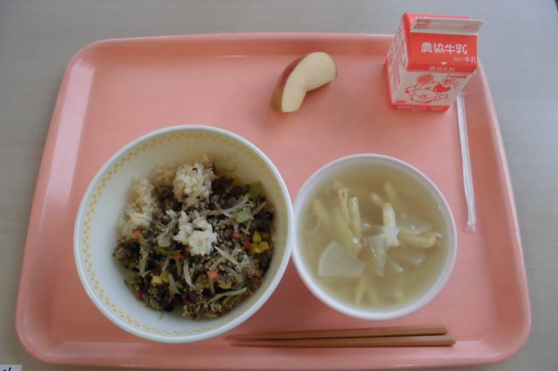 そぼろごはん みそ汁 りんご 牛乳