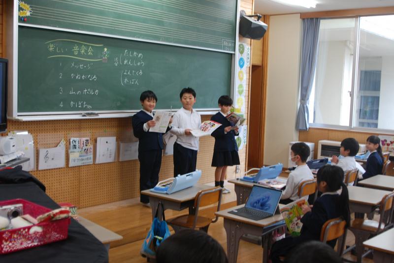 2年生は2学期に学習した歌や楽器で「音楽会」をしました。2グループに分かれて歌を歌ったり、合奏したりしました。