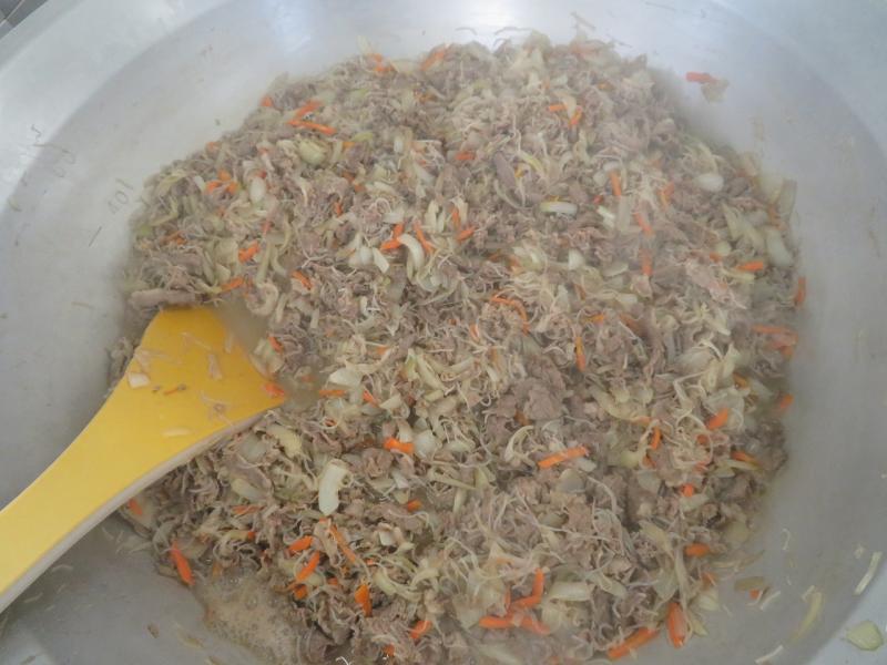 今日は、韓国料理のプルコギを作りました。プルコギは、しょうゆベースで甘口の下味をつけた肉や野菜を煮る料理です。給食では、野菜もたっぷり入れて甘めの食べやすい味付けにアレンジしています。苦手な野菜に少し苦戦している子もいましたが、頑張って食べていました。