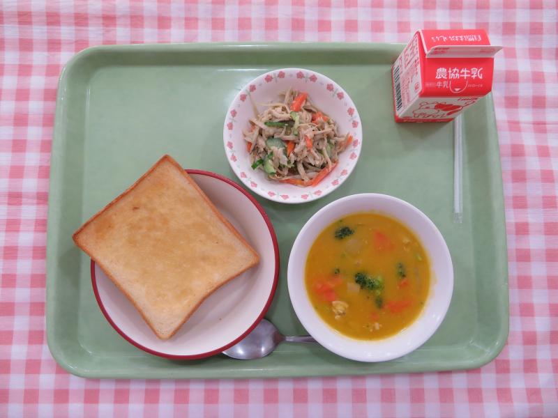 今日は、ハロウィンが近いので、かぼちゃを入れたかぼちゃシチューにしました。かぼちゃの甘さがおいしかったです。また、レモントーストは、はちみつ・バター・砂糖・レモン果汁を混ぜ合わせ、パンに塗って焼きました。レモンの風味がおいしかったです!