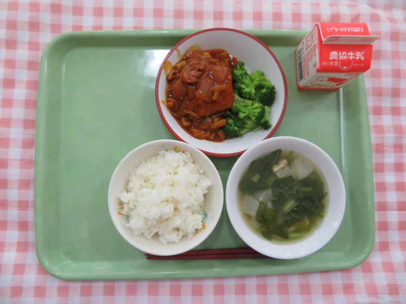 今日は手作りの煮込み風ハンバーグを作りました。給食では、ひき肉に少し木綿豆腐を混ぜることで、柔らかくあっさりと仕上がります。きのことたまねぎたっぷりのトマトソースもおいしかったです。