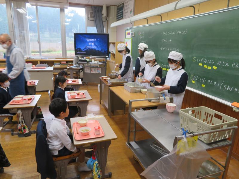 1年生の給食の準備は6年生がしてくれています。1年生は6年生の手際よく盛り付けをする姿を見ながら、静かに座って待っています。