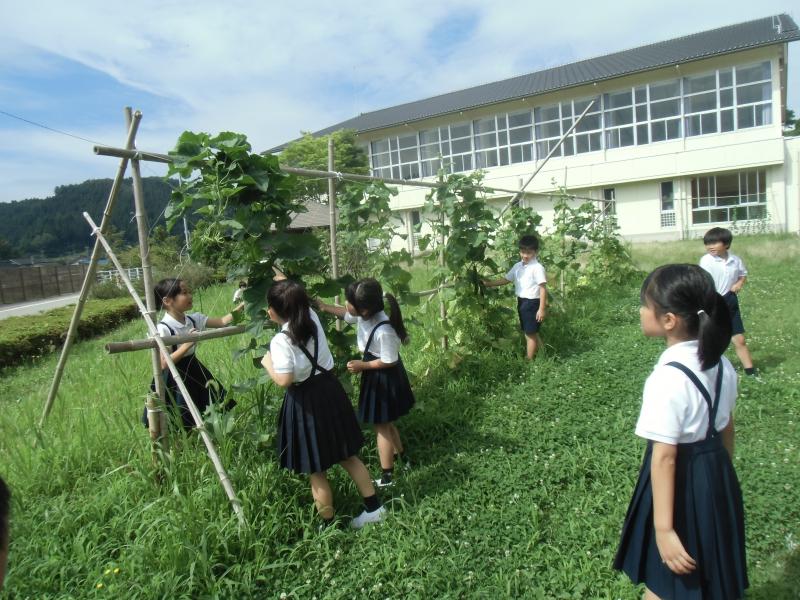 2年生は生活科で、きゅうりを育てています。その出来具合と言えば、とても大きなきゅうりがたくさん採れます。この日以外にも、次々と大きくなるので収穫しています。