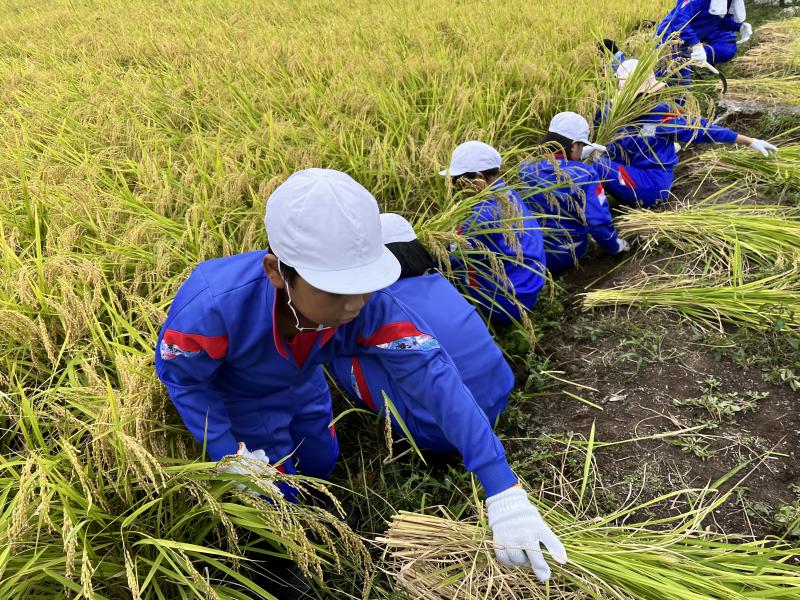 今年もJAさんや辻浦さん、国光地区の皆さんのご協力を得て稲刈り体験をしてきました。初めて鎌を持つ児童もいれば、家の田んぼでお手伝いをしたことがある児童もいました。収穫の喜びと、手作業の苦労を実感することができました。