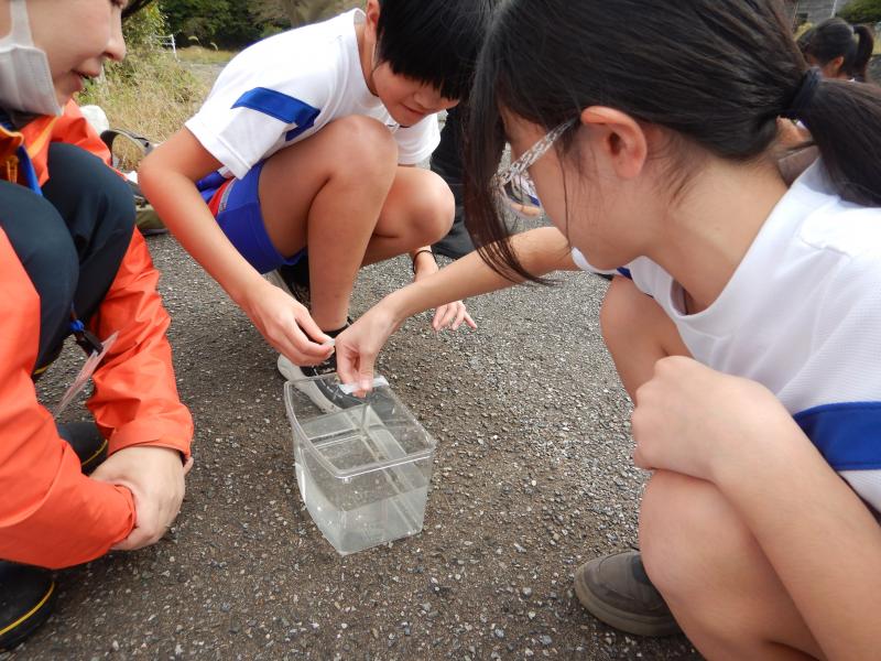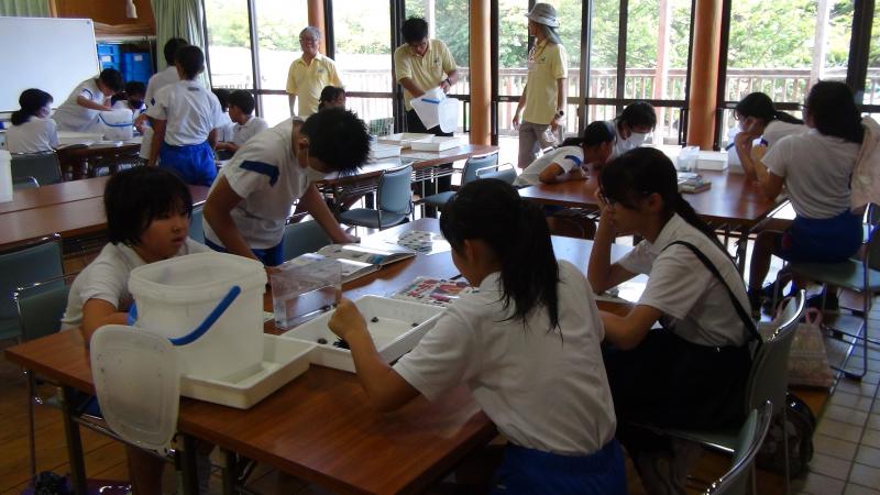 はじめに、能登里海教育研究所の松本先生の指導のもと、パックテストで川の水の汚れ具合を調べました。