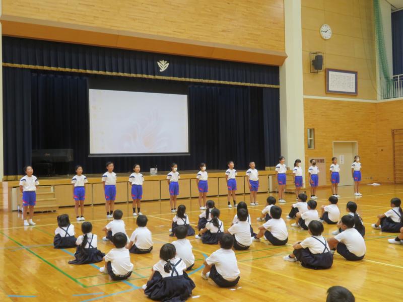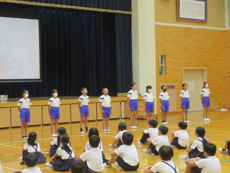 児童集会では、2年生が英語の歌「BINGO」を、4年生は詩「この胸に」の音読を披露してくれました。どちらも堂々と大きな声で発表することができました。