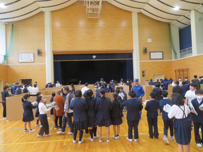 11月11日は町の総合防災訓練の日です。本校も、地域住民の皆さんと一緒に避難訓練や「防災スリッパ」づくりを体験しました。中学生は非難された方が使用するパーテンション(間仕切り)作業していました。
