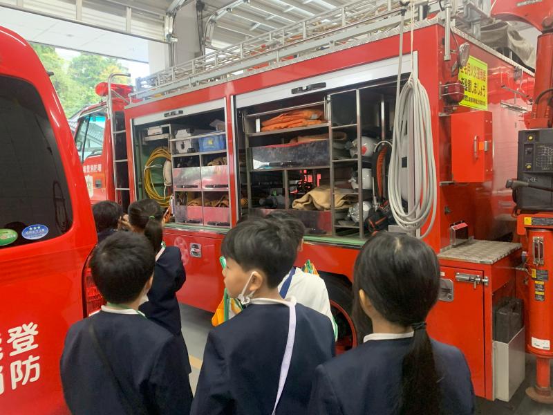 社会科「安全なくらしを守る人々の仕事」で能登消防署の見学に行きました。施設見学だけでなく出動の様子や放水体験もさせてもらいました。火事や事故から私たちを守るための工夫をたくさん発見することができました。