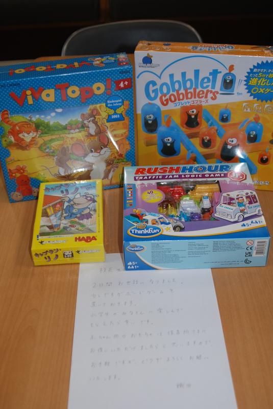 2月に入って、県内の小中学校から事務の先生が、柳田小学校でお仕事をしていただきました。その中のお一人で、織田美香先生から保育所や小学校に「おもちゃ」「ゲーム」をいただきました。ありがとうございます!