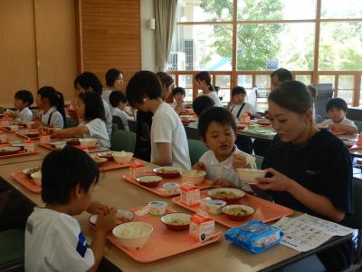 保護者の皆さんに、学校の給食はどのようもので、児童の食べる様子はどうのようなのかを見ていただきました。1年生児童は、お父さんやお母さんと一緒なので、少し緊張したかも知れませんね・・。