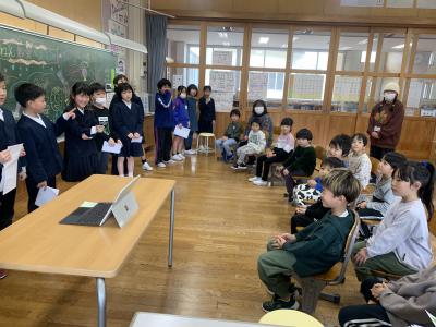 3年生が、来年入学してくる保育所の年長さんと交流しましました。学校の様子などを、それぞれのグループで工夫して紹介しました。