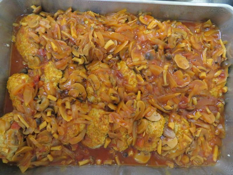 今日は手作りの煮込み風ハンバーグを作りました。給食では、ひき肉に少し木綿豆腐を混ぜることで、柔らかくあっさりと仕上がります。きのことたまねぎたっぷりのトマトソースもおいしかったです。
