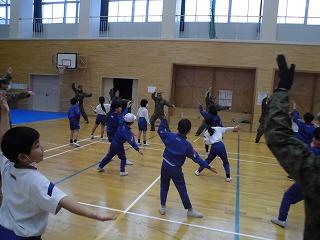 その皆さんにお願いして、体育の授業をしていただきました。自衛隊体操やほふく前進リレー、ドッジボール対決など、たくさんの種目を用意していただき、楽しい授業をしてくださいました。