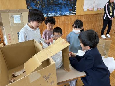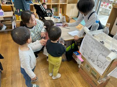 21日(木)の2限目に、保育所の園児を迎えて「秋のおもちゃランド」を開催しました。1・2年生が、秋の木の実や葉っぱなどを使った、様々なおもちゃを楽しんでもらいました。