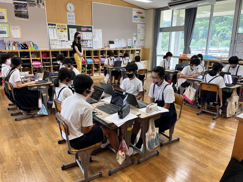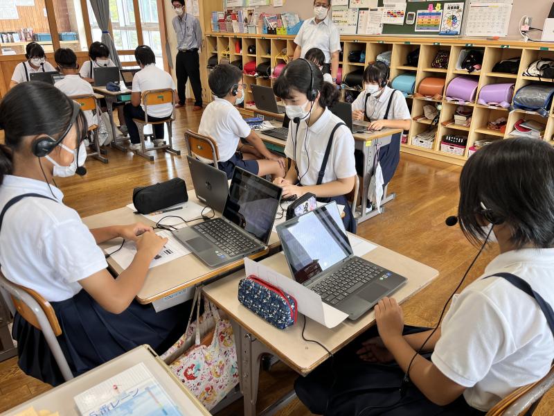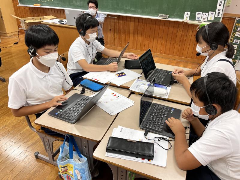 5年生と6年生が、一人一台端末を使って、外国人の先生と1対1で会話の練習をしました。最初は戸惑ったようでしたが、「楽しかった」という声も多くありました。