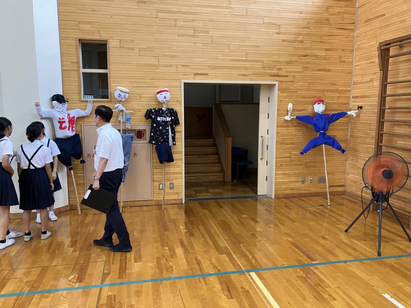 5年生と6年生が、保護者の方と一緒に案山子をつくりました。班ごとにポーズや衣装を工夫し、8体の案山子が完成しました。