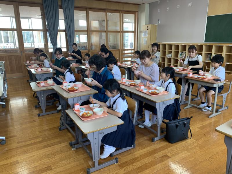 1年生の保護者の皆さんを対象として、給食試食会を行いました。メニューは「ごはん」「イカのチリソース」「即席漬け」「豚汁」「ヨーグルト」「牛乳」でした。