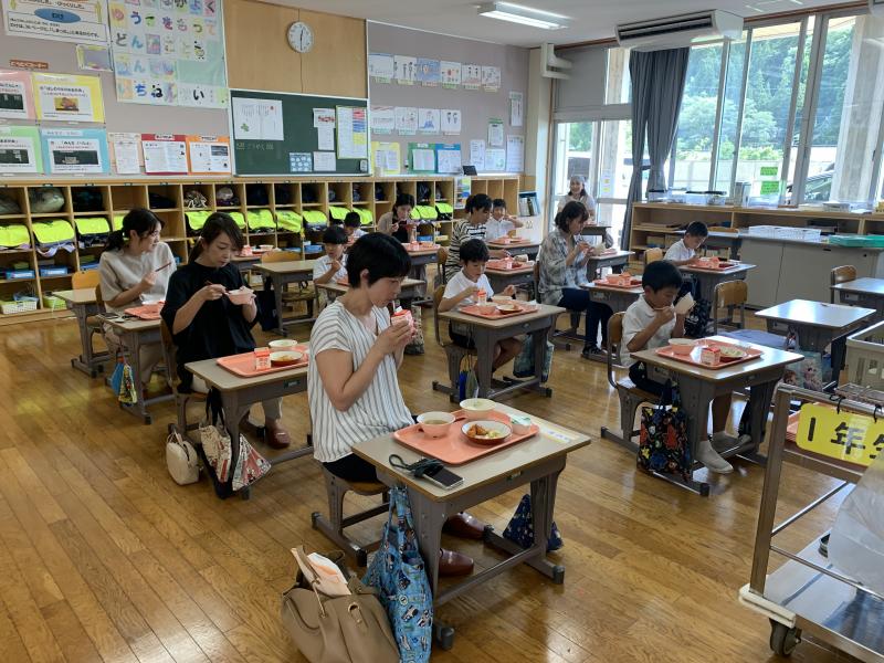 1年生の教室だけでは狭いので教室を二つに分け、お子さんの様子を見ながら給食を食べていただきました。普段の給食よりも、嬉しそうに食べていた1年生たちです♡