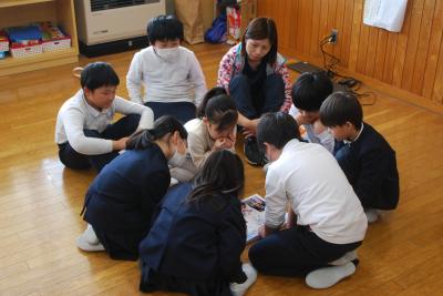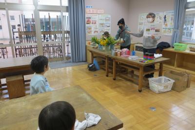 3年生が、来年入学してくる保育所の年長さんと交流しましました。学校の様子などを、それぞれのグループで工夫して紹介しました。