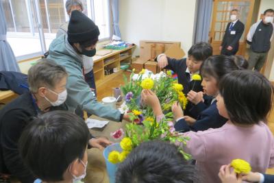 学校に花の色どりをMOAのスタッフにいただいています。今回は3年生に花を選んでもらい、それぞれの花瓶に生けてみました。