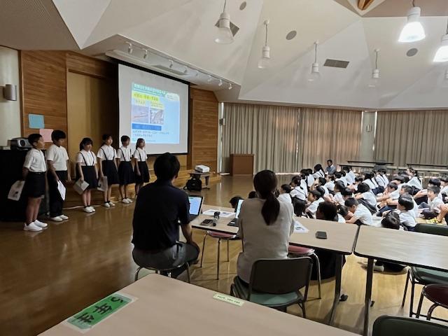 27日の大阪・関西万博での発表を控えたメンバー。今日は、全校児童の前で発表しました。