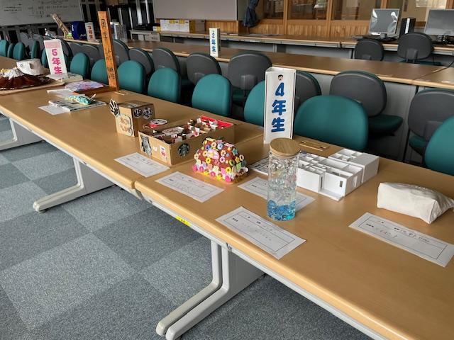 1階パソコン室の机の上に並べられています。また、書道やポスターなどの応募作品は、図工室に・・!