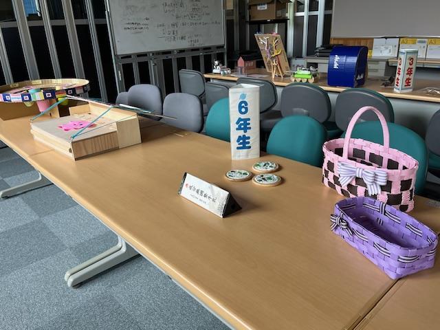 その向い。6年生の図工の作品が整然と並んでいました。くるくる回すと、ユニークな動き。想像を超える工夫がみられ、個性を感じます(^^♪